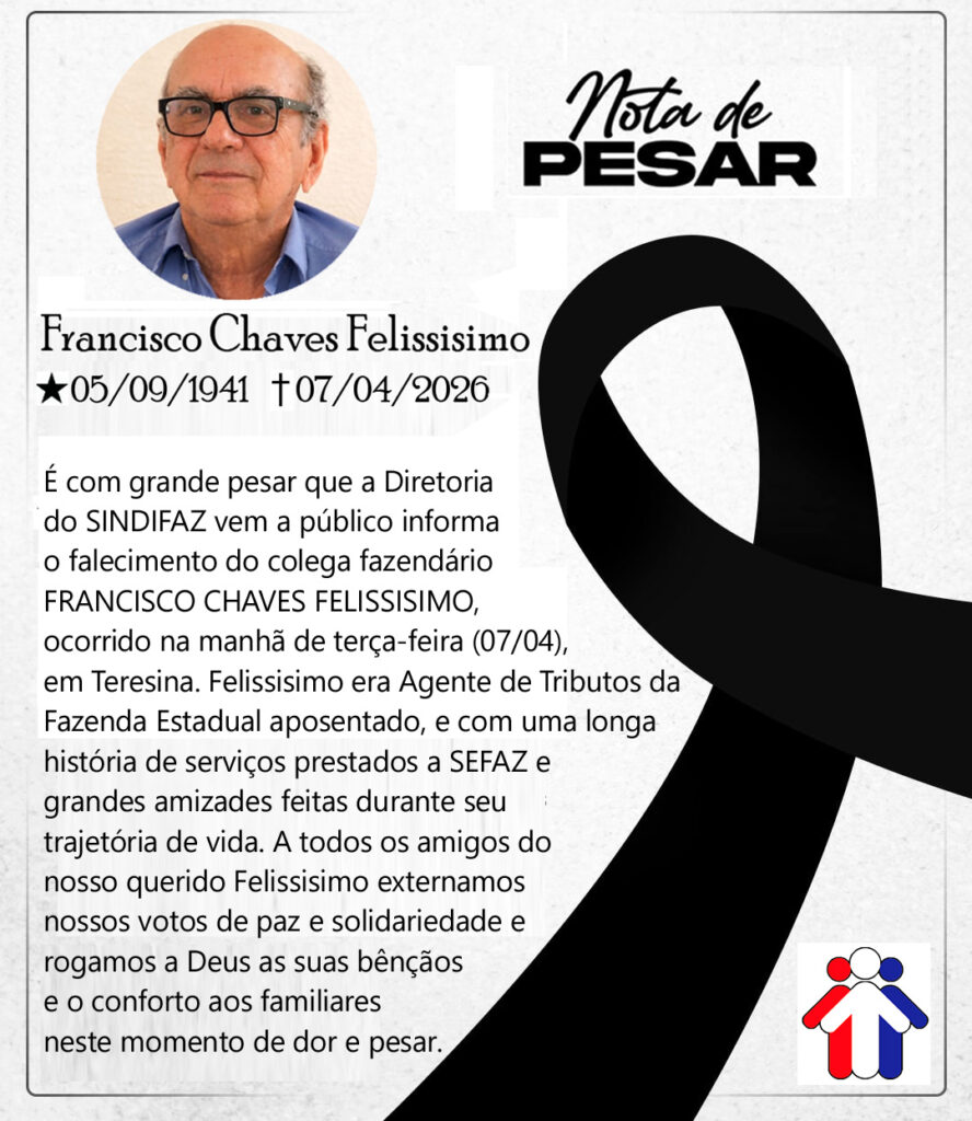 É com grande pesar que a Diretoria do SINDIFAZ vem a público informa o falecimento do colega fazendário FRANCISCO CHAVES FELISSISIMO, ocorrido na manhã de terça-feira (07/04), em Teresina.